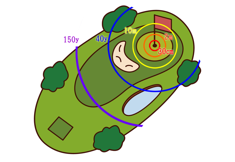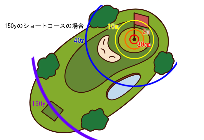 ショートホールの場合、5番目の半径(150y)から、1打で2番目(2m)の半径に入ることも考えられます。