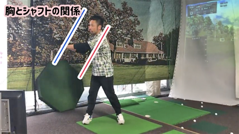 トップで胸とシャフトが平行になり、平行をキープしたままスイングします。
