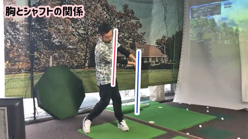 体(胸)とシャフトの関係は、構えている時は「垂直」、テイクバックからフォローまでは「平行」になります。